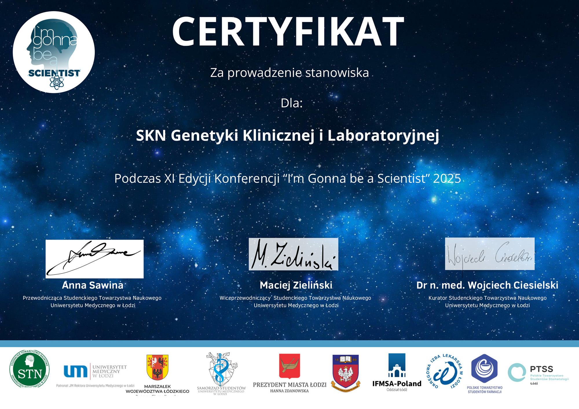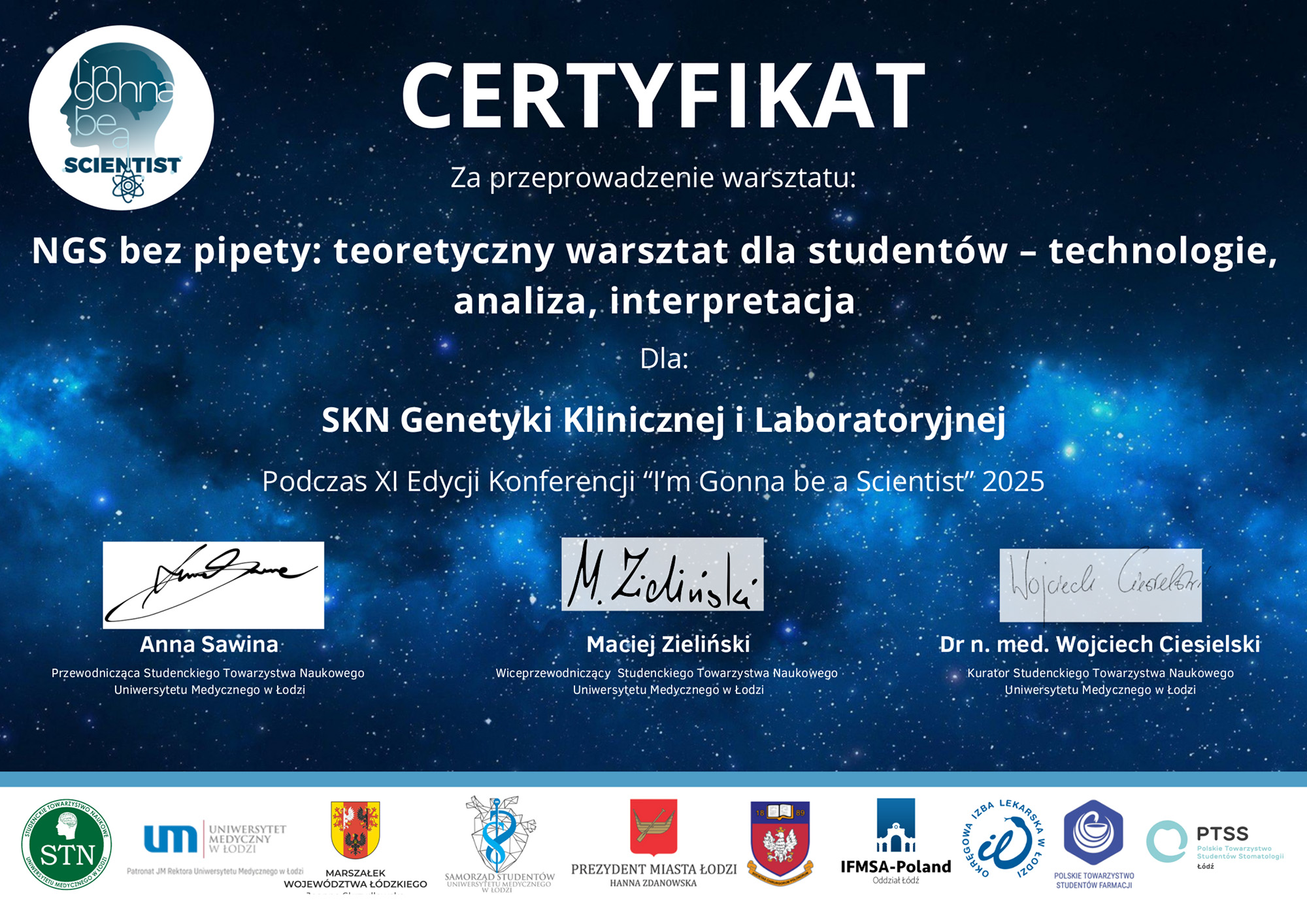 Miło nam poinformować, iż nasze Koło naukowe SKN Genetyki Klinicznej i Laboratoryjnej prowadziło stanowisko podczas XI Edycji Konferencji „I’m Gonna Be a Scientist” 2025. Dodatkowo podczas wydarzenia, członkowie Koła, przeprowadzili warsztat: NGS bez pipety: teoretyczny warsztat dla studentów – technologie, analiza, interpretacja. Dziękujemy wszystkim uczestnikom za udział!